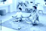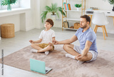 Young smiling father doing yoga exercise with little child boy sitting on the floor in lotus pose at home with a laptop having online video call doing online sport training. Family workout concept.