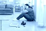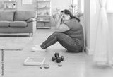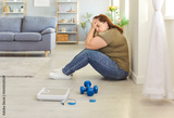 Portrait of depressed upset fat woman covering face with hands at home. Overweight stressed young girl sitting on floor near scale, measuring tape and dumbbells tired of trying to lose weight.