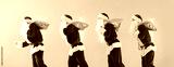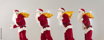 Funny people wearing Santa Claus red suits with beard walking in a row in empty light studio holding golden gift bags with presents. Christmas and New Year celebration concept. Banner.