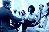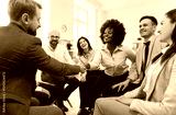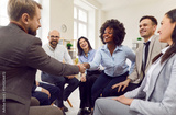 Happy smiling African American woman shaking hands with male colleague or business coach. Multiracial business team sitting together in circle during work meeting, team building or training in office.
