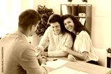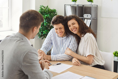 Happy young couple sitting close together and hugging during meeting with realtor in office. Cheerful man and woman celebrating property purchase or rent after signing contract at real estate agency.