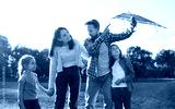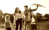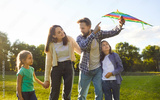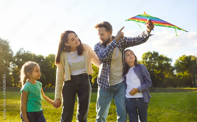 Portrait of happy family holding toy kite in hands in sunny summer park outdoors. Father, mother and kids enjoying spending time in nature together flying kite. People and family leisure concept.