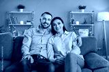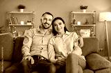 Portrait of young happy married couple sitting on sofa in living room at home. Smiling family man and woman on couch hugging and looking at camera. Harmonic relationships and Valentines day concept.