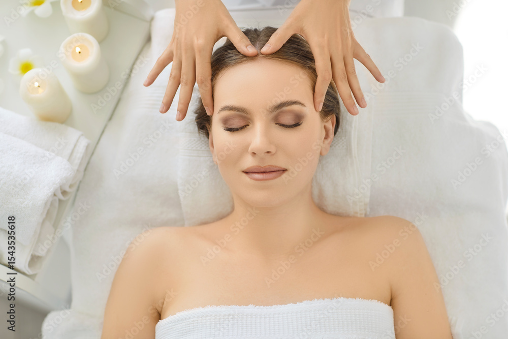 Cosmetologist performing female face, head spa massage, skin, hair beauty treatment, improving mood, appearance, relaxed girl getting facial rejuvenating, cleansing, moisturizing in salon, clinic
