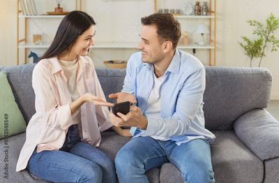 Happy boyfriend presenting engagement ring to girlfriend, making marriage proposal, enjoying their special moment together at home, posing at sofa. Dating, relationship and lovee concept
