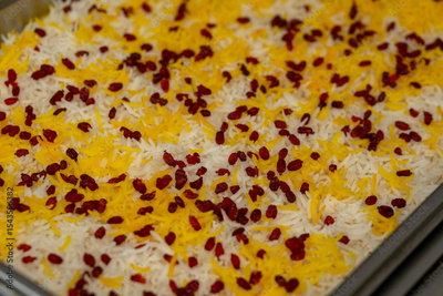 Kabuli Pulao, Afghani Cuisine with Pilaf, Pilau in Street Buffet, Traditional Afghanistan Pilaw