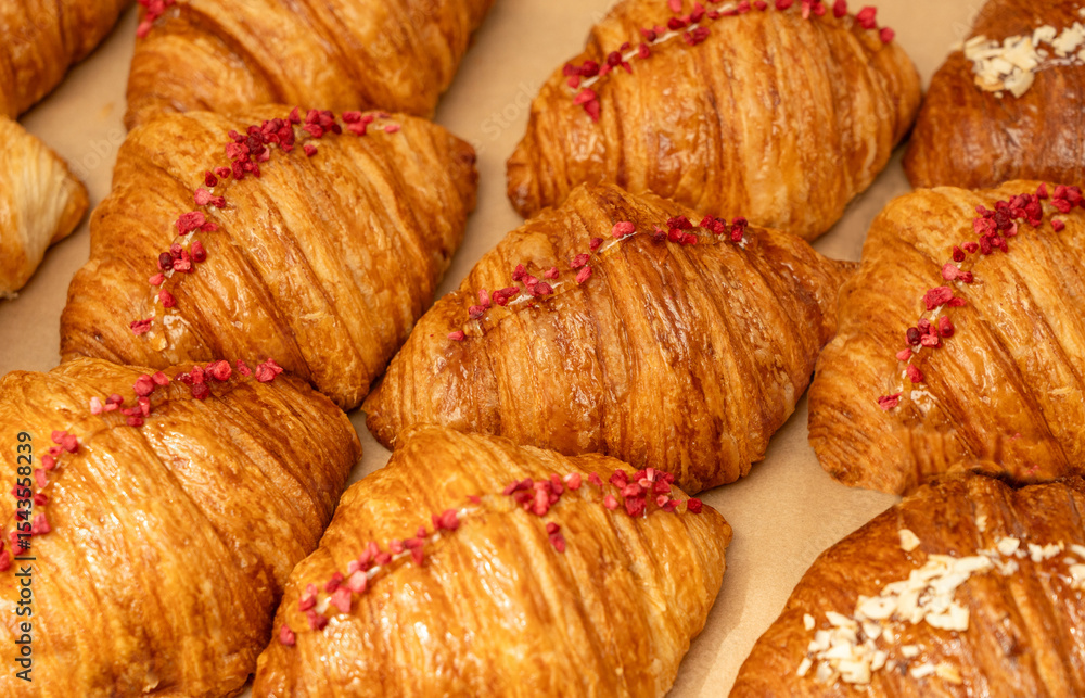 Many Croissant at Street Market, Fresh Puff Pastry Pies, Sweet Kipferls, Buttery Viennoiseries