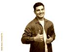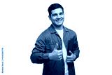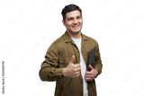 Smiling young man gives a thumbs-up while holding a laptop, showcasing confidence and positivity
