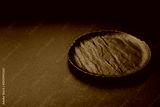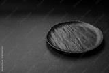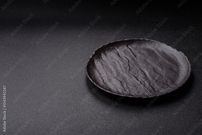 Empty round black plate for food, risotto or pasta. Empty plate on dark background