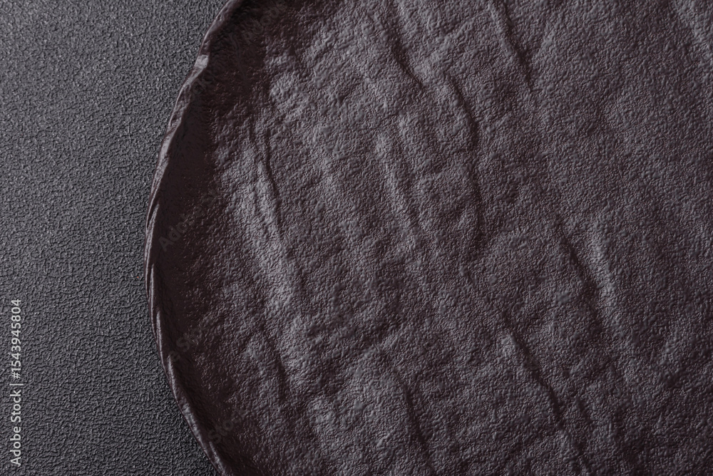 Empty round black plate for food, risotto or pasta. Empty plate on dark background