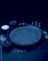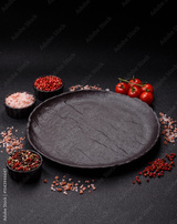 Empty round black plate for food, risotto or pasta. Empty plate on dark background