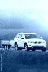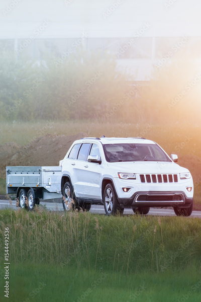 Black estate car towing covered trailer