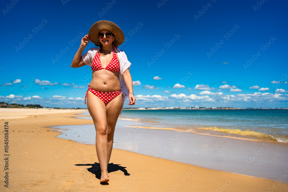 Beautiful middle aged woman sunbather in straw hat walking on sandy beach in summertime. Front view. Meia Praia beach in Lagos, Portugal