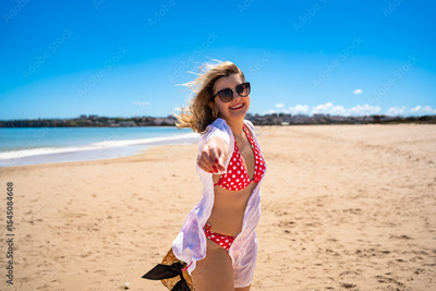 Portrait of beautiful middle aged woman sunbather enjoying holidays on sandy beach in summertime