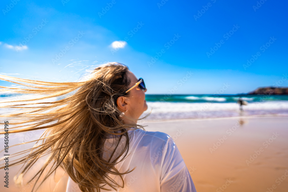 Beautiful middle aged woman with flowing hair standing over ocean on windy sunny day. Back view