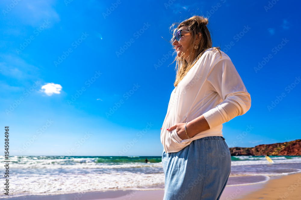 Portrait of beautiful middle aged woman enjoying walk on sandy beach in summertime. Amado beach on Algarve coast in Portugal
