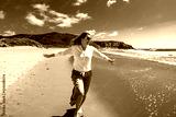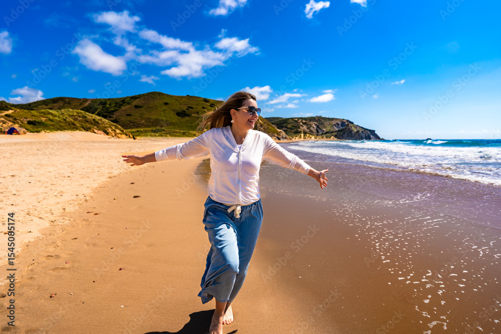 Portrait of beautiful middle aged woman enjoying walk on sandy beach in summertime. Amado beach on Algarve coast in Portugal