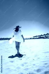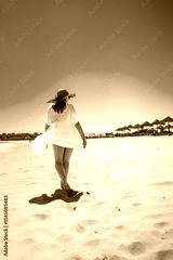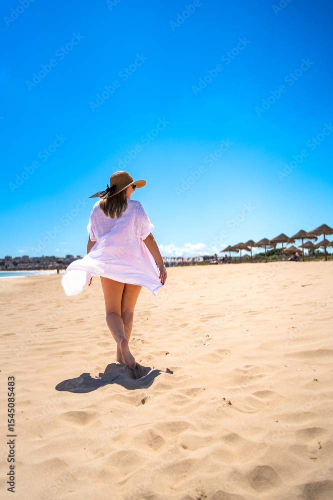 Beautiful middle aged woman sunbather in straw hat walking on sandy beach full of beach umbrellas in summertime. Back view. Meia Praia beach in Lagos, Portugal