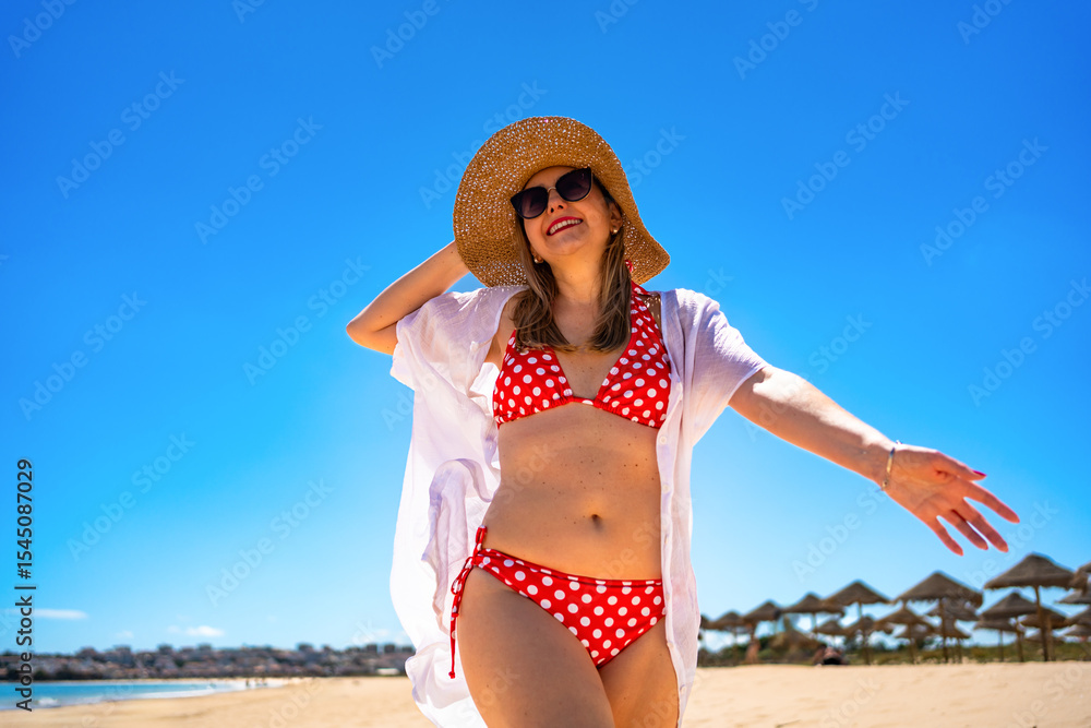 Portrait of beautiful middle aged woman sunbather enjoying walk on sandy beach in summertime
