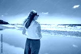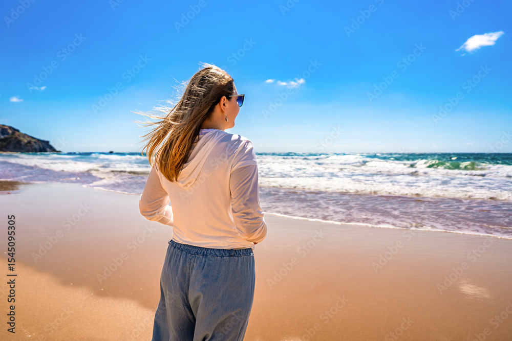 Beautiful middle aged woman standing over ocean looking at big waves on sunny day. Back view. Amado beach on Algarve coast in Portugal