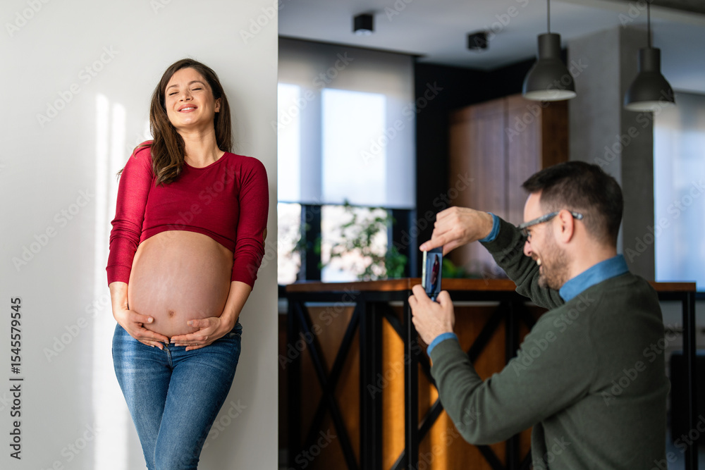 Multiethnic happy pregnant couple using mobile phone for vlogging, take photo, communicating online