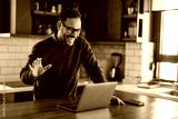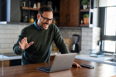 Businessman executive coach using laptop computer, having video conference call virtual meeting