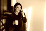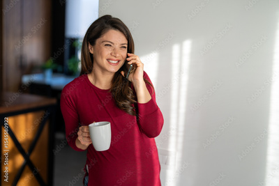 Beautiful happy fit pregnant woman talking on her phone while having a cup of coffee in the morning