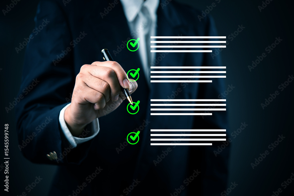 Man in suit completing virtual checklist, business success, goal accomplishment. Concepts task management, quality assurance, strategic planning, corporate responsibility, and reliable outcomes.