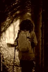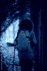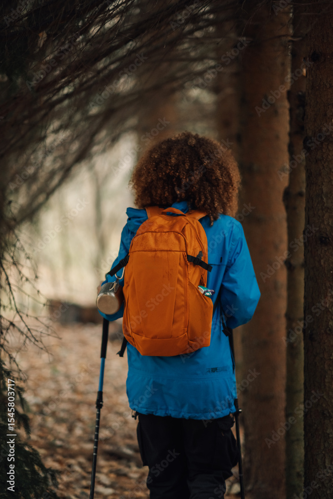 Hiker walking on path in forest wearing orange backpack and blue jacket