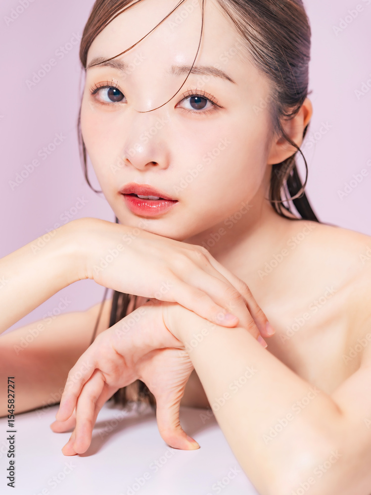 Beauty portrait of young attractive Asian woman. Skincare, cosmetics, make-up, hair removal concept.