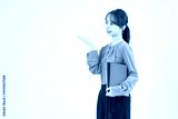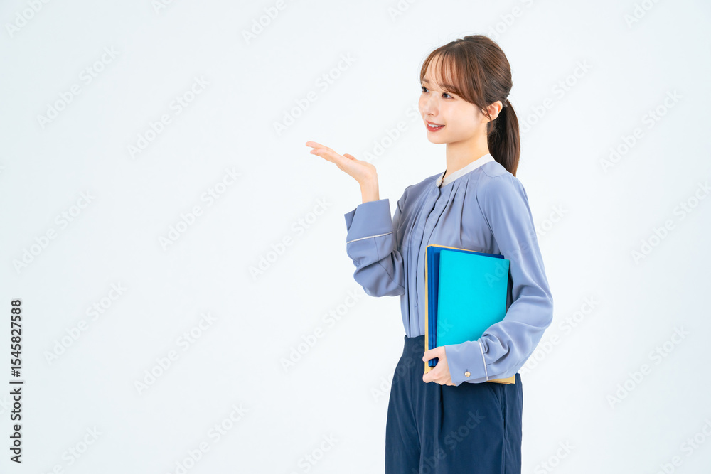 案内するカジュアルウェアの女性