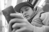Portrait of a 12 year old boy in a cap and green jacket playing a game on a mobile phone while sitting in a subway car.