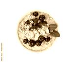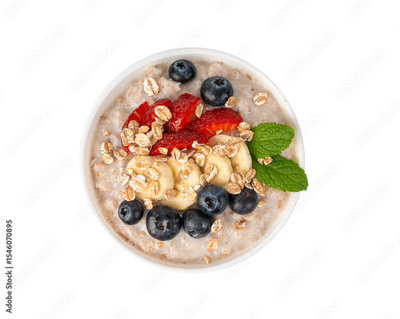 Cooked spelt in bowl isolated. Oatmeal milk porridge with fruits and berries