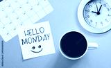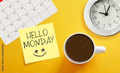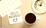 Hello Monday is shown using the text and photo of coffee cup and calendar