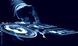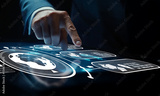 Businessman interacts with digital interface showing global connections, data analysis, and innovative technology in a futuristic environment