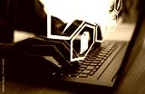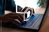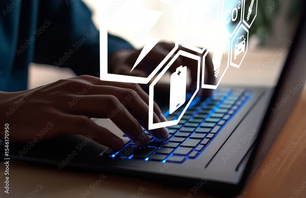 Close-Up of Hands Typing on Laptop with Digital Icons Representing Technology and Innovation in Modern Workspace