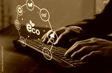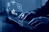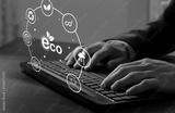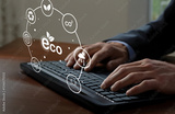 Business professional using laptop with eco-themed digital icons, showcasing sustainability and environmental awareness in modern workplace