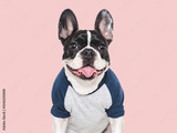 Stylish puppy and t-shirt. Dog smile. Studio shot, isolated background. Closeup, indoors. Pets care concept