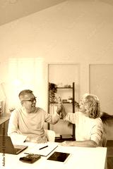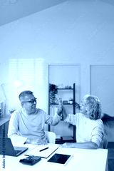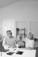 Happy Asian Senior Couple Celebrating Success with High Five at Home Office Elderly Asian Couple Enjoying Retirement Together Concept at Desk