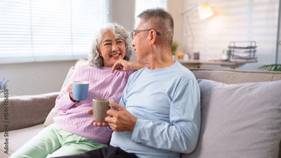 Senior Asian Couple Relaxing with Coffee on Sofa At Home Enjoying Retirement Happiness Together Elderly Love and Care Relationship Lifestyle
