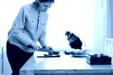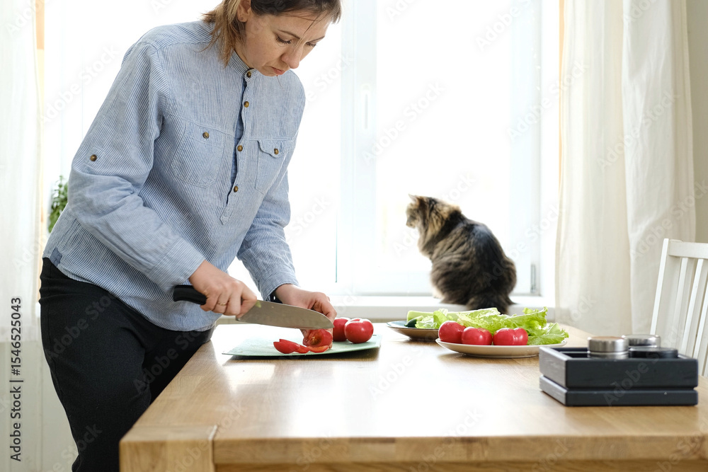 Close up of a woman chopping vegetables in a kitchen. Female hands cutting tomato, carrot on the board to preparing food. Then woman stir fried vegetables in a frying pan. Cooking in the kitchen