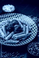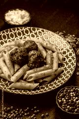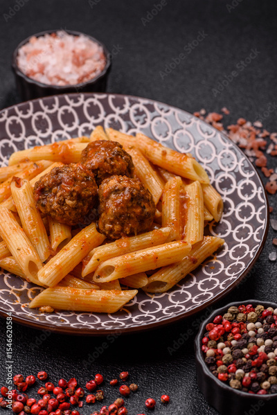 Penne pasta with meatballs in tomato sauce with salt and spices. Italian food penne pasta