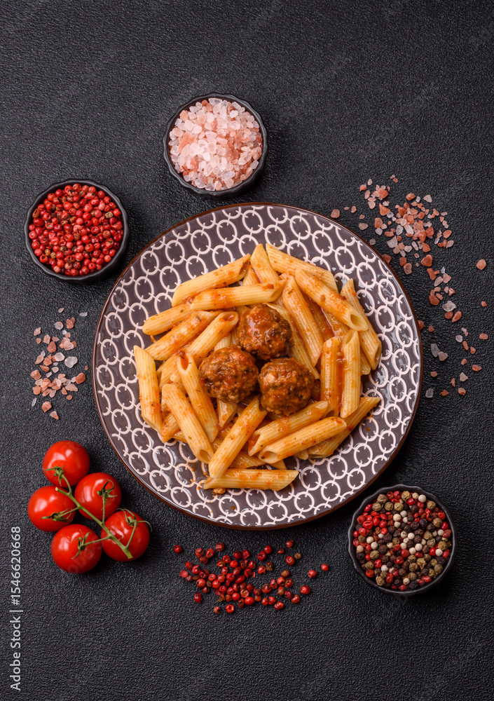 Penne pasta with meatballs in tomato sauce with salt and spices. Italian food penne pasta