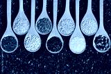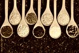 Top view different rice on wooden scoop with black riceberry background, Various rice organic on wooden spoon collection