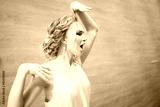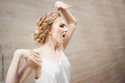 close-up portrait of a young happy sweet slim sexy young curly blonde woman in white lace lingerie morning bride on a sunny day on the green porch smiling and posing lifestyle
