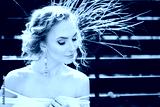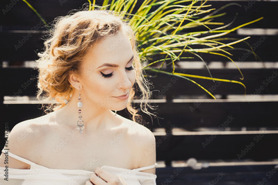 close-up portrait of a young happy sweet slim sexy young curly blonde woman in white lace lingerie morning bride on a sunny day on the green porch smiling and posing lifestyle
