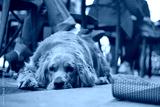 Golden retriever resting in a busy outdoor cafe
