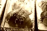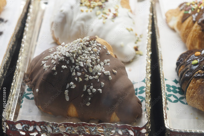 Delicious pastries displayed at a bakery on a busy day