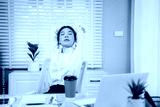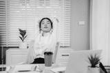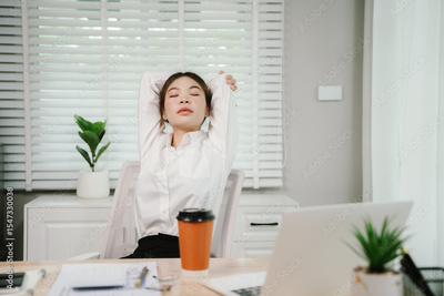 A young Asian woman stretches at her office desk, taking a peaceful break from work.
