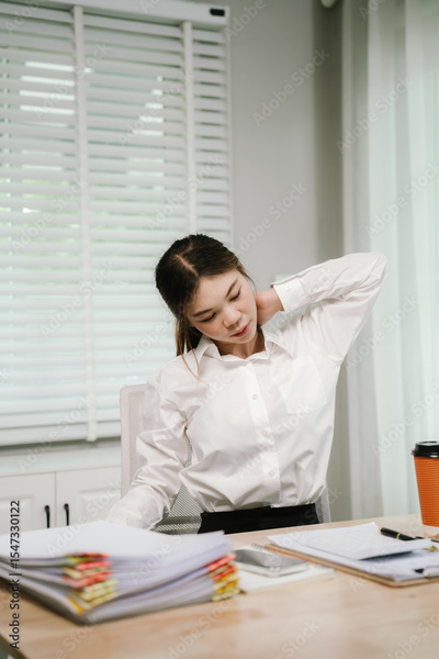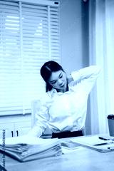 A young Asian woman stretches at her office desk, taking a peaceful break from work.